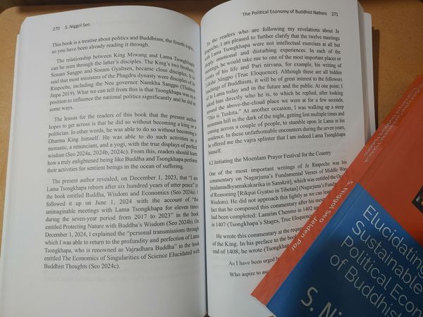 Prepared for the revelations since December 2023, Prof. S. Niggol Seo has published the Four Ornaments to Je Tsongkhapa’s Lamrim Chenmo. The first ornament entitled “Buddha, Wisdom and Economics” dealt with economics (in January 2024). The second ornament entitled “Protecting Nature with Buddha’s Wisdom” addressed nature and environmental philosophies (in July 2024). The third ornament entitled “The Economics of Singularities of Science Elucidated with Buddhist Thoughts” addressed science (in December 2024). The fourth ornament, which is this book, entitled “Elucidating the Sustainable Political Economy of Buddhist Nations” addresses the politics and governance (in May 2025).